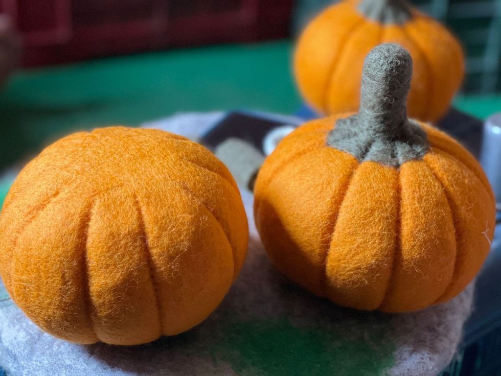 The creation of wool felt pumpkins is a labor of love that involves the fusion of water felting and needle felting techniques. Water felting establishes the pumpkin’s base by combining wool fibers through moisture, friction, and heat, while needle felting adds intricate details, texture, and shaping. This harmonious combination results in the formation of stunning, lifelike pumpkins that perfectly capture the essence of autumn.