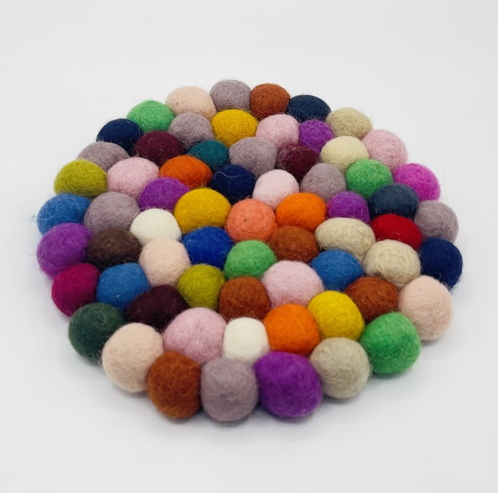 Our pot stand features a unique design with colorful felted wool balls arranged in an eye-catching pattern. Each felt ball is carefully handcrafted using traditional felting techniques, where the wool fibers are agitated with soap and water to create a dense and durable product. The felted wool balls are then attached securely to a sturdy fabric base, ensuring stability and durability.